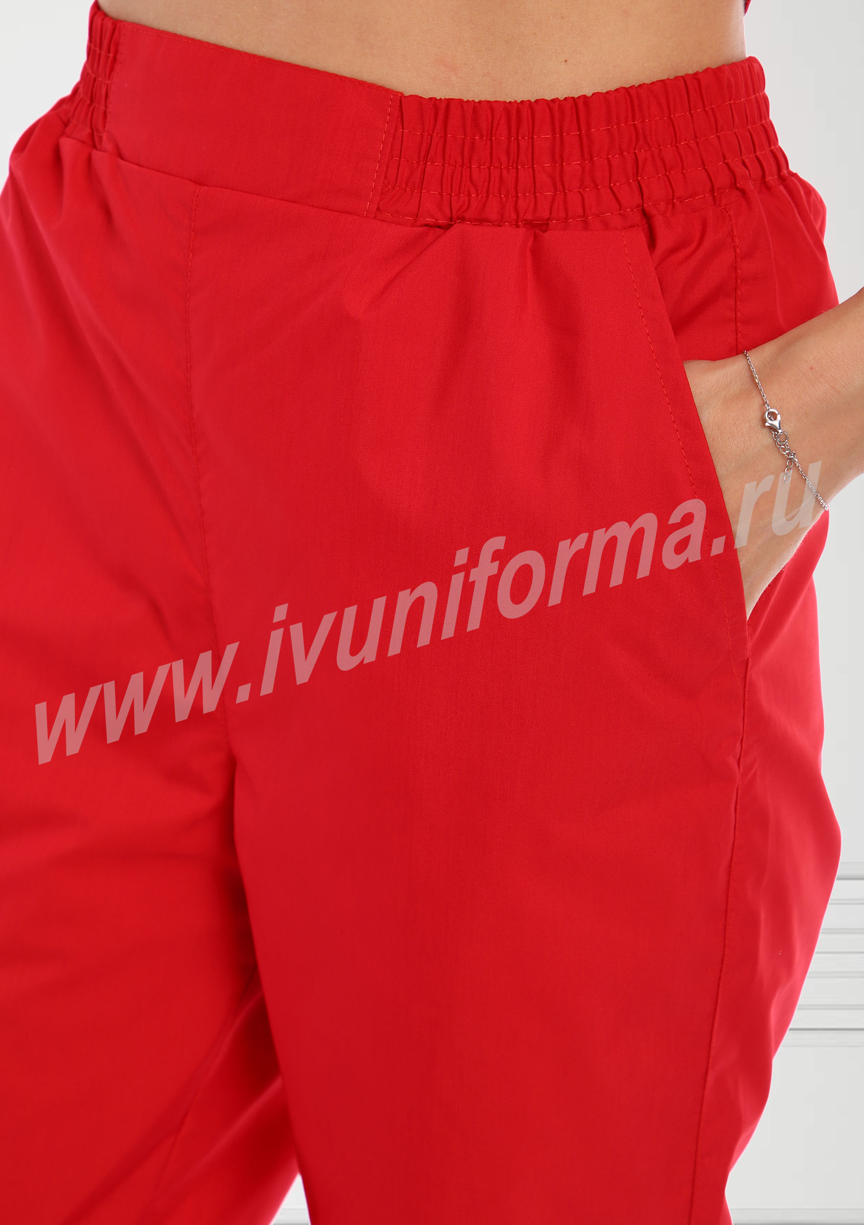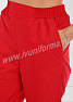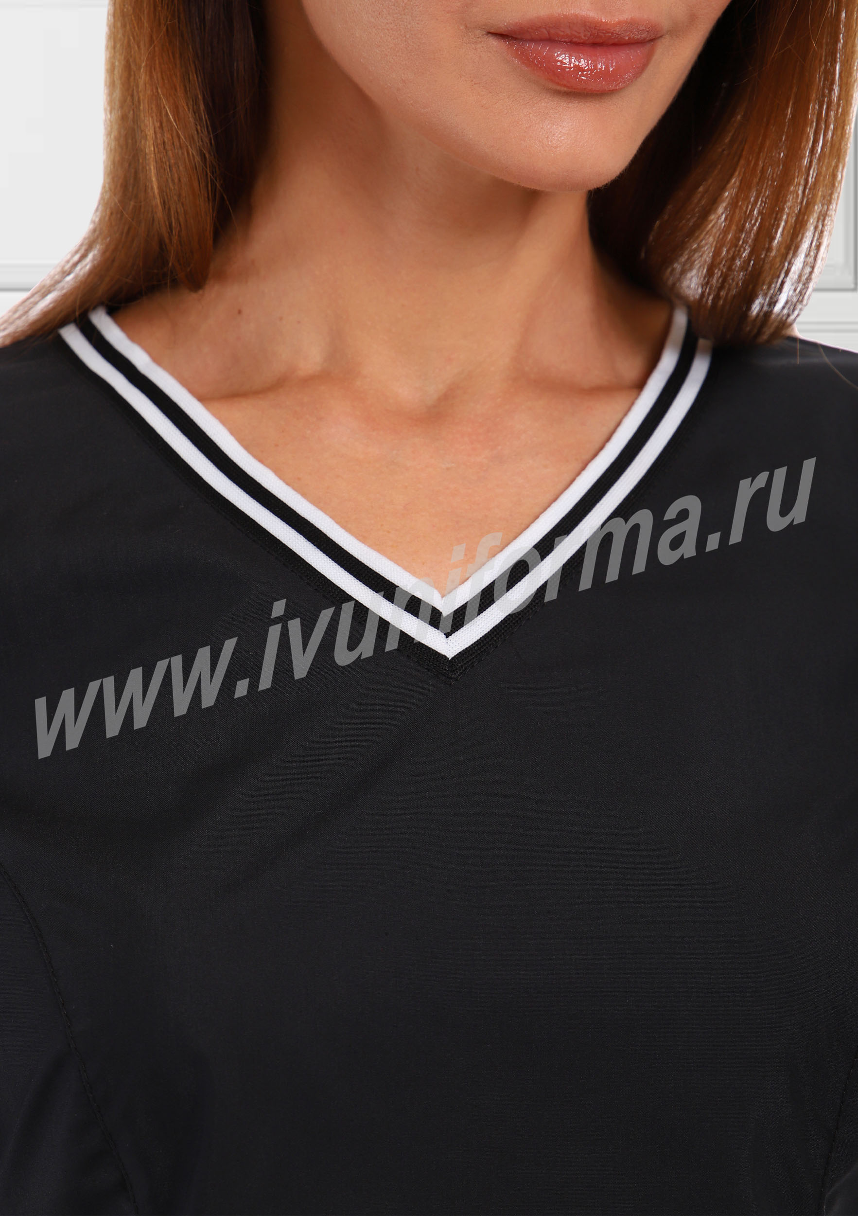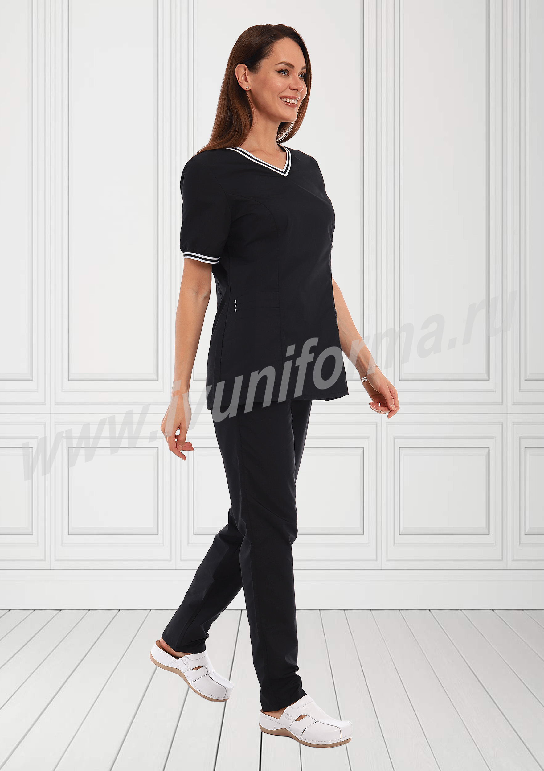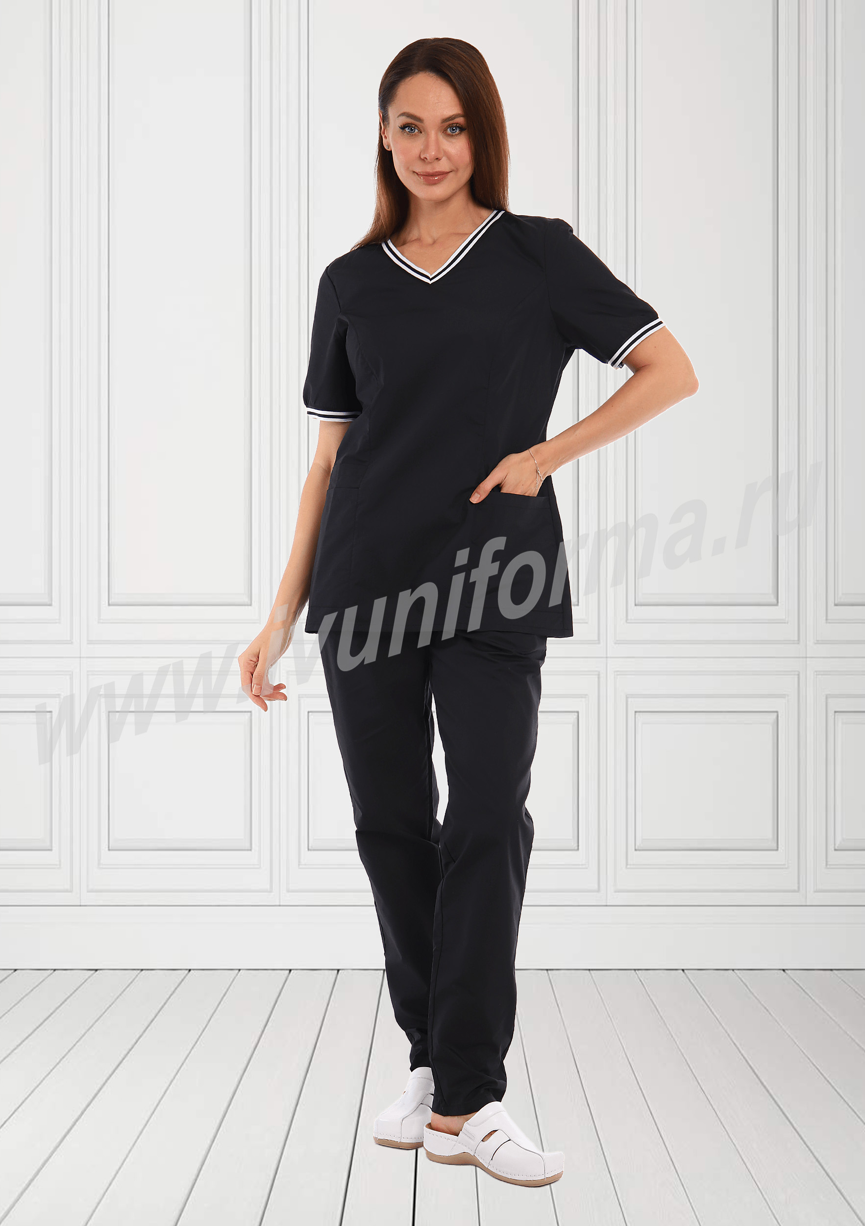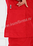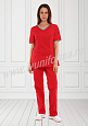 Медицинский костюм, выполненный в современном спортивном стиле, состоит из куртки и брюк. Куртка прилегающего силуэта, средней длины, с V-образным вырезом горловины, короткими рукавами. Полочка и спинка с рельефами, выходящими из проймы. В нижней части полочки присутствуют два вместительных накладных кармана, с правой стороны предусмотрен дополнительный карман для мелочей. Контрастная отделка из мягкой трикотажной ленты по горловине и низу рукавов делает костюм ярким и эффектным. Брюки прямые на эластичном поясе имеют два кармана с косой линией входа. Костюм выполнен из легкой смесовой ткани, прост в уходе, предназначен для медицинских работников и персонала СПА салонов.